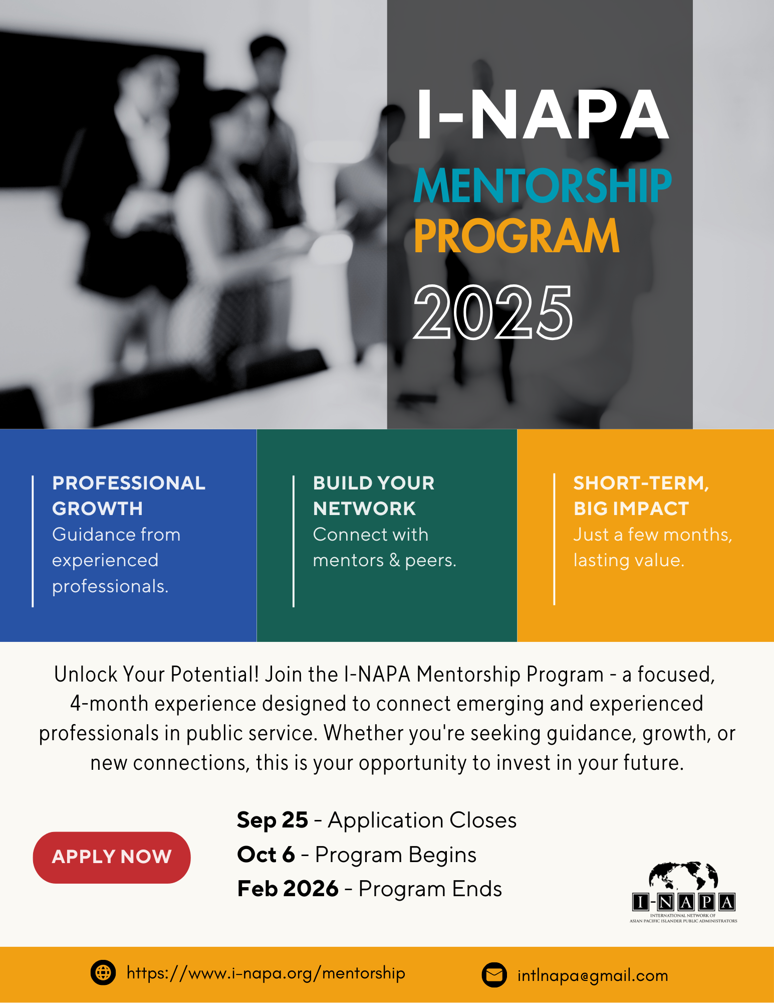 Are you ready to take the next step in your career—or give back by sharing your experience with others? The International Network of Asian Pacific Islander Public Administrators (I-NAPA) invites you to join the 2025 Mentorship Program!