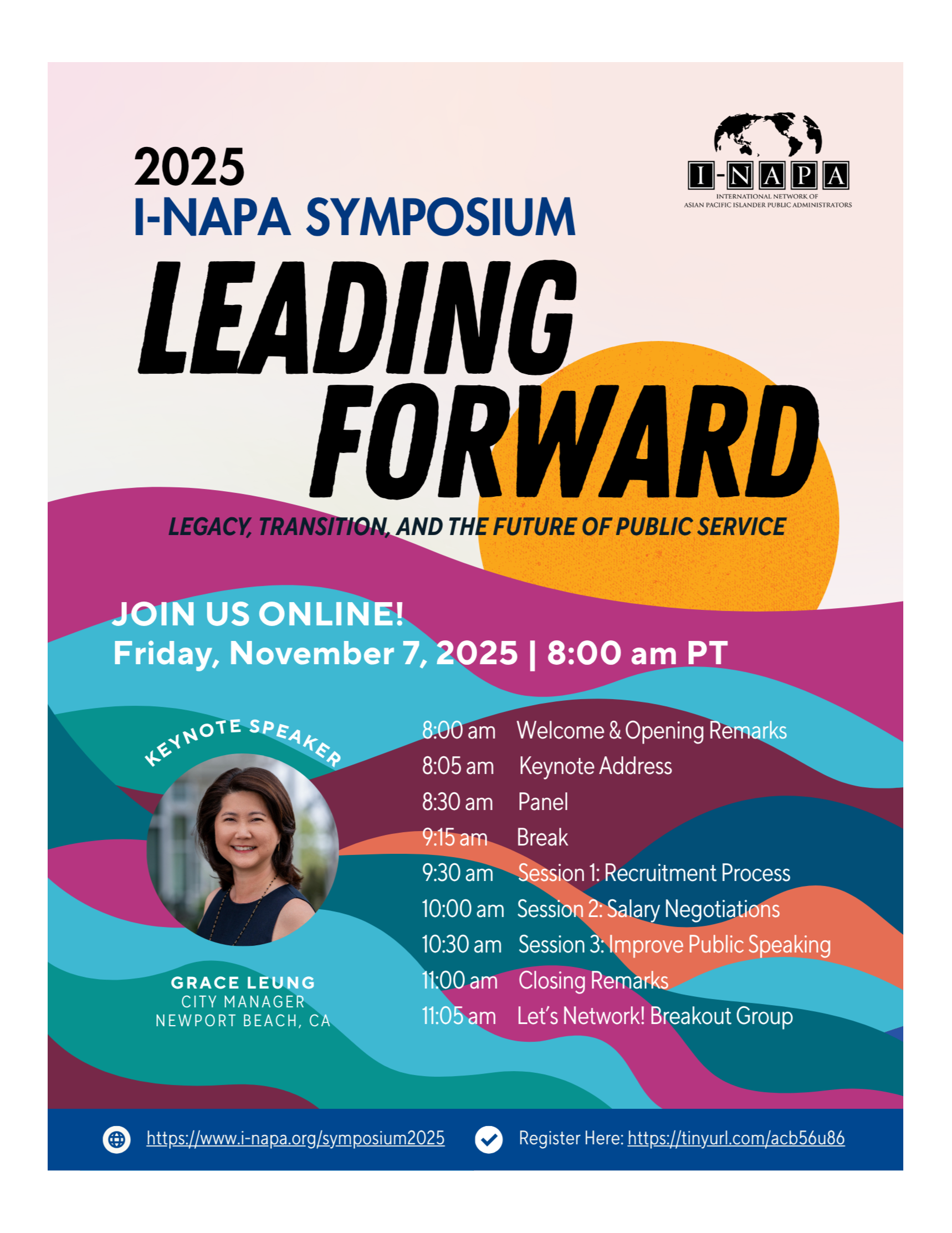 Join the International Network of Asian Pacific Islander Public Administrators (I-NAPA) for our 2025 Symposium, Leading Forward: Legacy, Transition, and the Future of Public Service. This virtual gathering will explore how todayβs leaders are shaping a more inclusive, sustainable, and resilient public sector for future generations.